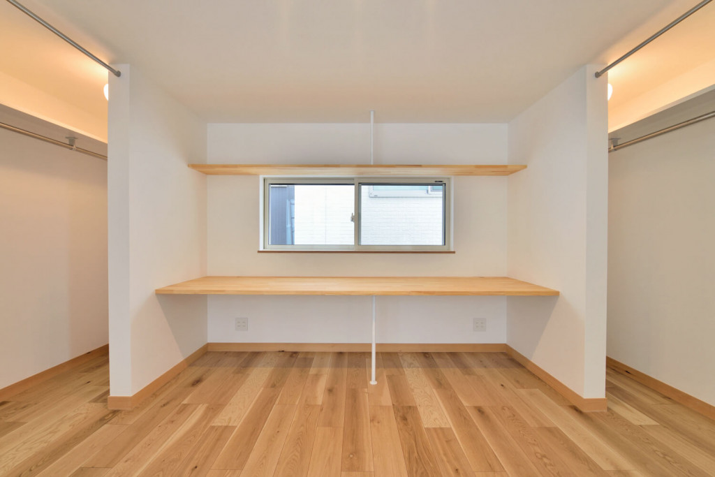3階は、書斎・寝室としての機能を持たせつつ、小上がりやデスクカウンターの造作、さらに大量にものをしまえるウォークインクローゼットを部屋の両サイドに配置。