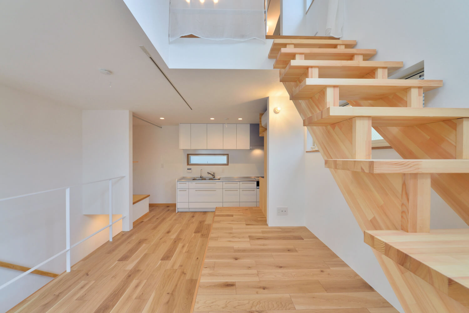 壁や天井の白色と、床・階段・家具・窓枠の木の素材でシンプルな仕上がりにすることで、お住まいになった後、家具や生活に必要なものを配置しても、それらが自然と馴染むような空間になっています。