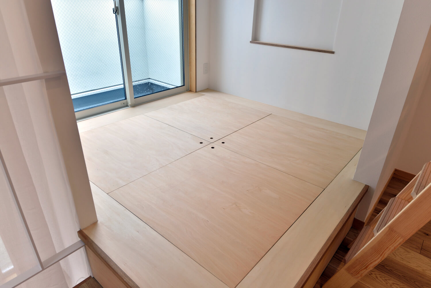 さらにステージ下は奥行きの十分な収納スペースにもなっており、空間を有効に使っています。