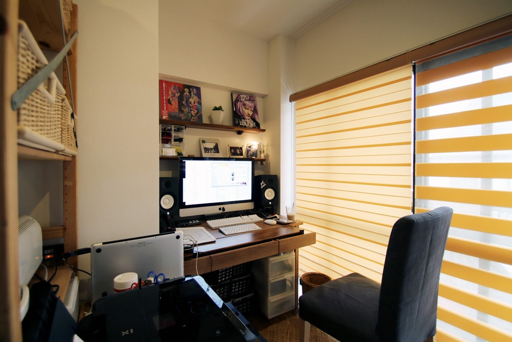そんなお気に入りのLDKは趣味のもので彩られ、反対にワークスペース周辺は仕事関係のもので固められています。言葉どおり家具やファブリックでゾーニングしながら、明確に空間を使い分けているようです。デスクはちょうどよいサイズのものを探すのに苦労したそう。対面の造作シェルフの棚をあえて一段取り外して使うなど、自分らしい工夫を追求されている様子が伝わってきます。キッチンのシェルフも仕切りとなり、しかも圧迫感のない空間構成になっています。