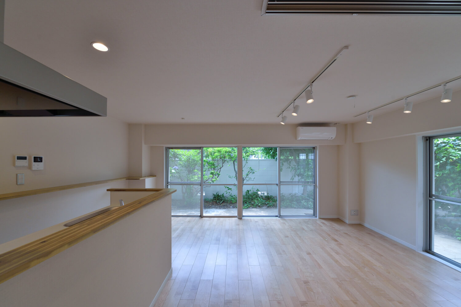 角部屋、庭付きの2LDK。14.5帖のLDKの掃きだし窓には、専用庭の緑がパノラマに広がります。
