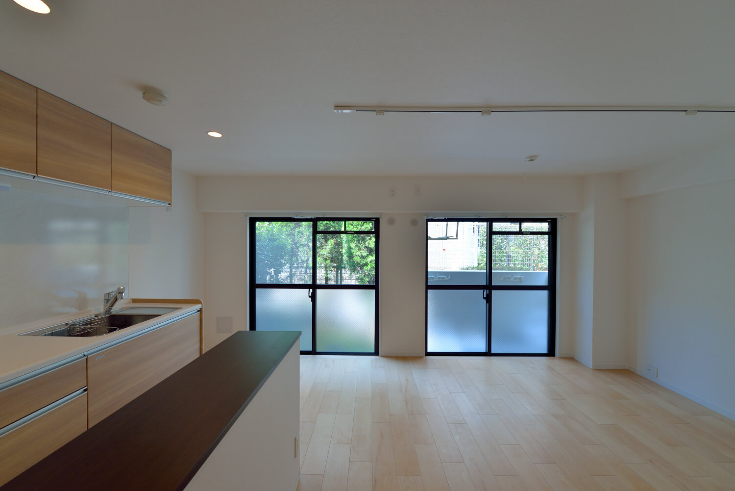 2つの居室を区切っていた壁を取り払い、一面から自然光の取り込める約11帖のLDK空間を設けました。