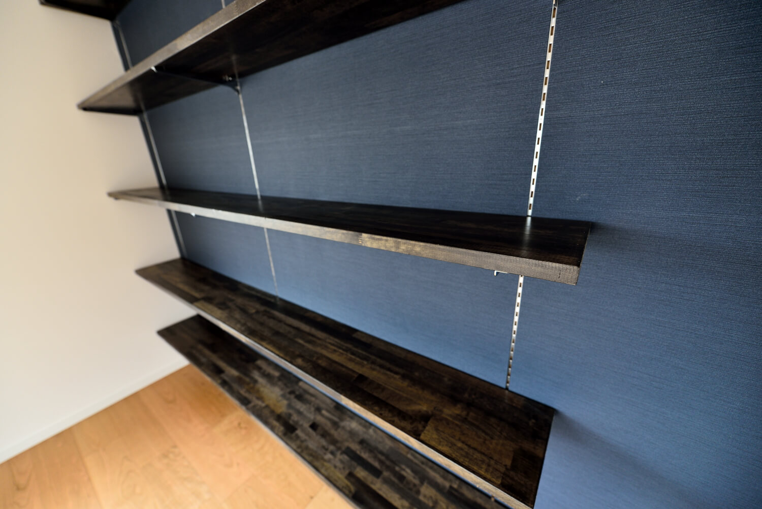 それぞれに大きな本棚を設け、その背面をネイビーに、棚を濃いブラウンでまとめ、落ち着きのあるスキッとした大人のプライベート空間を演出しています。