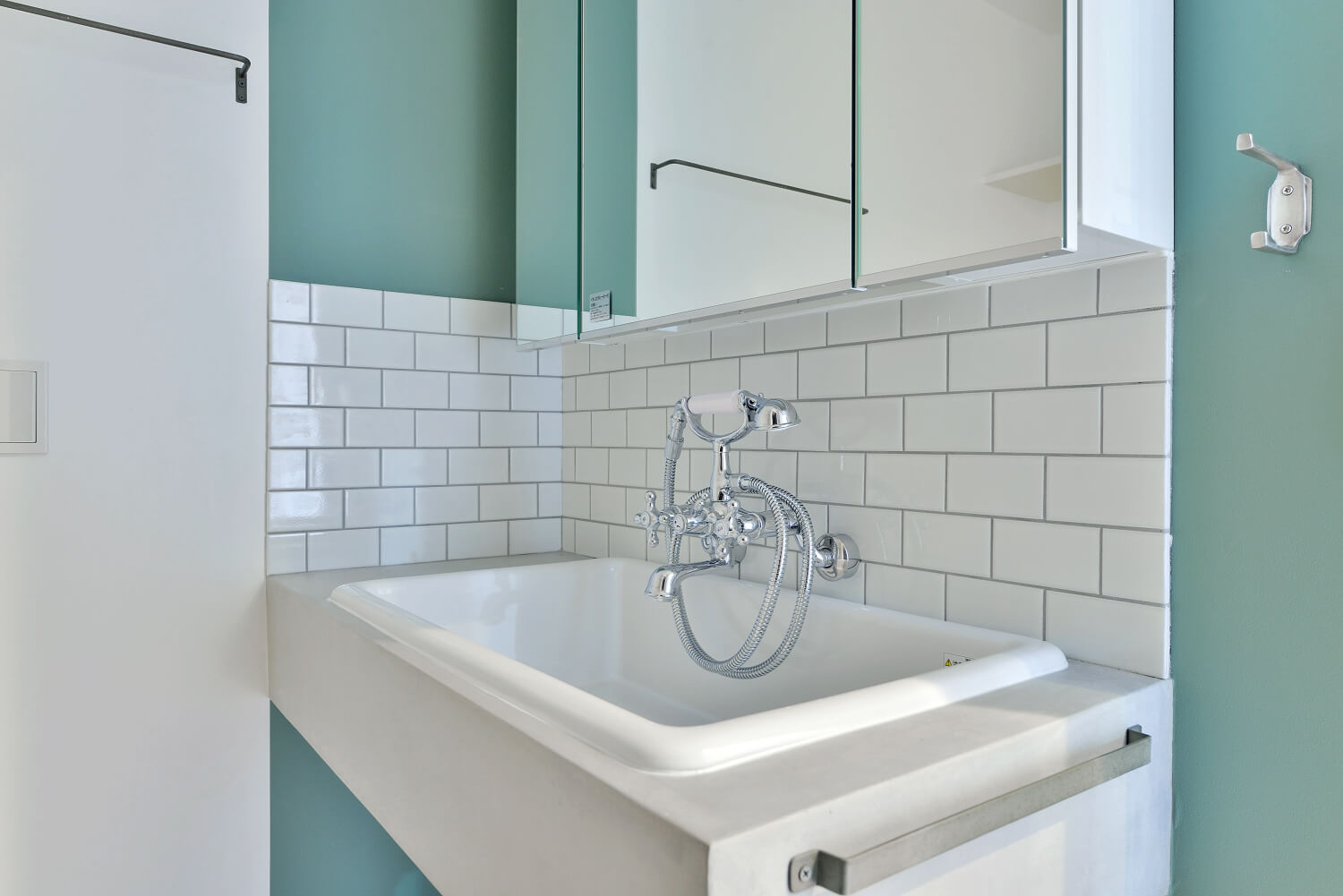 サニタリーの洗面カウンターは、キッチンと同様のフロストタイル&実験用シンク&モールテックス仕上げのコーディネート。