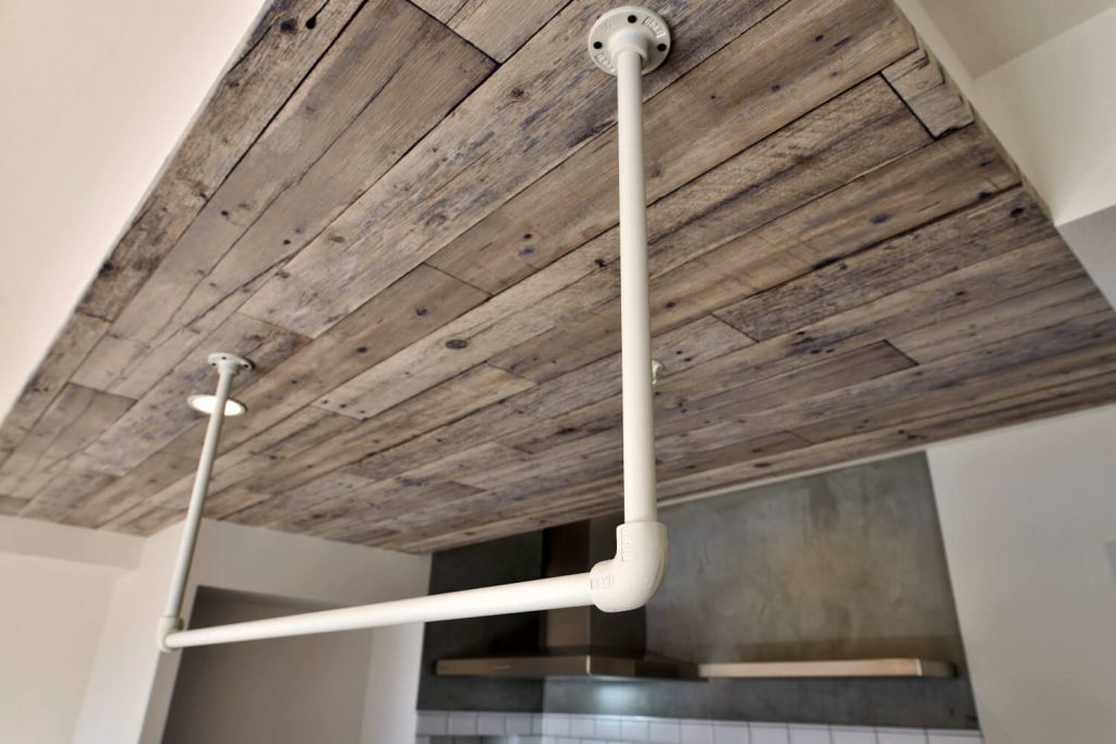下がり天井には木目でアクセントをつけ、さらにパイプの吊り収納、モールテックス、フロストタイルなどで演出。
