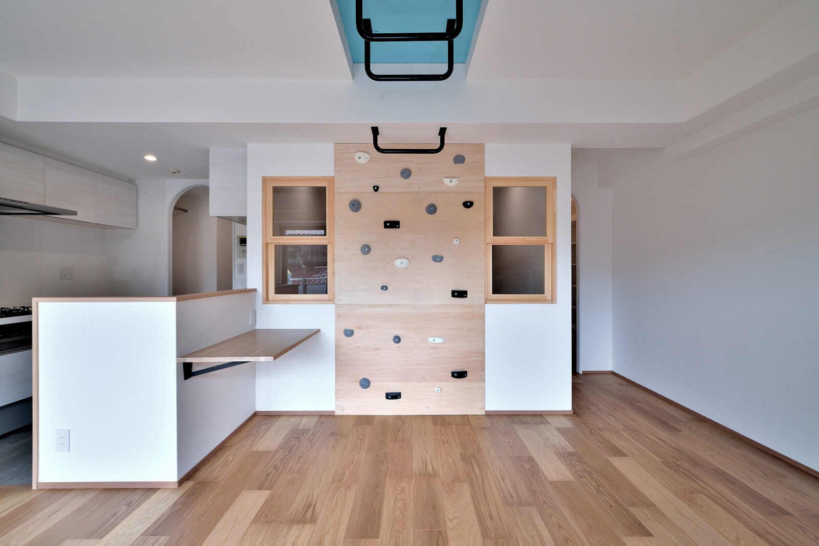 あっと目を惹くリビングのボルタリングとうんていはお子様のご希望でつけさせて頂きました。デザインもまとまるようにリビングの中央にアクセントとして、シンメトリーになるように設計し、モノトーンで空間を引き締めるアクセントとしました。また天井の開口はうんていの設置の為開口させて頂きましたが、楽しい雰囲気のあるご家族でしたので空色をご提案させて頂きました。うんていは、お子様がご使用されない時物干しとしてもご活用頂けております。