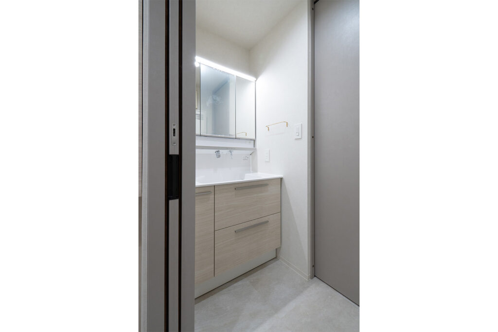 サニタリーエリアは洗面室、脱衣室、ランドリースペースと家事の空間をそれぞれ分けることで、家族の誰かが入浴中でも、気にせず洗濯物を畳んだり、歯磨きをすることができます。